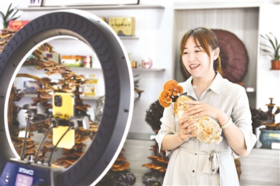 7月9日,在冠县店子镇,主播在进行灵芝直播带货。