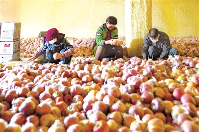 入冬时节,郊区西南舁乡五里庄村村民忙着把刚采摘的苹果进行挑选、分装,准备迎接前来采购的客人。五里庄村共有村民200余户,几乎家家种苹果,全村共种植苹果树、梨树200多亩。一直以来,他们靠着科学种植、科学储存,加强品牌意识,收成一年比一年好,村民收入一年比一年多。今年全村共收获苹果10多万公斤。截至目前,村民人均收入逾12000元。 张泽慧摄