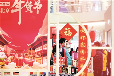 12月30日,在北京年货节启动活动的年货市集区,商户在展示年货商品。当日,2023北京年货节开幕。据介绍,作为北京消费季跨年活动,年货节覆盖北京60余个商圈、千余家品牌企业,形成“国内+国际、线上+线下、文化+消费”联动的格局,助力拉动年节消费,促进商品消费和服务消费恢复。年货节将持续至2023年2月5日。 新华社记者鞠焕宗摄