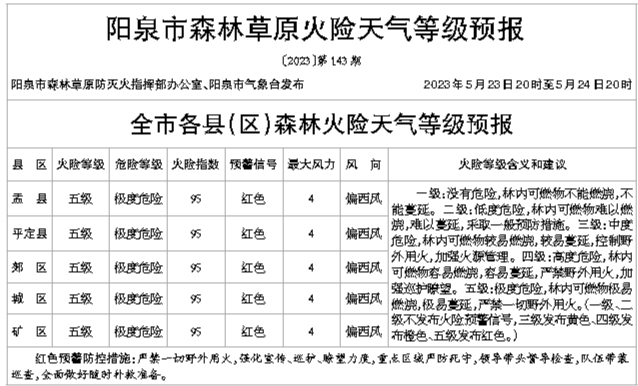 阳泉市森林草原火险天气等级预报〔2023〕第143期