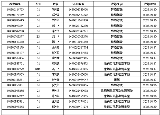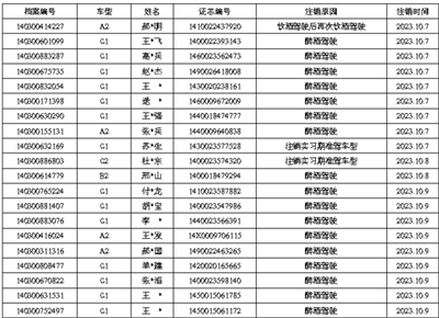 根据《机动车驾驶证申领和使用规定》(公安部162号令)第七十九条第一款第六项之规定,现公布以下机动车驾驶人驾驶证被注销。