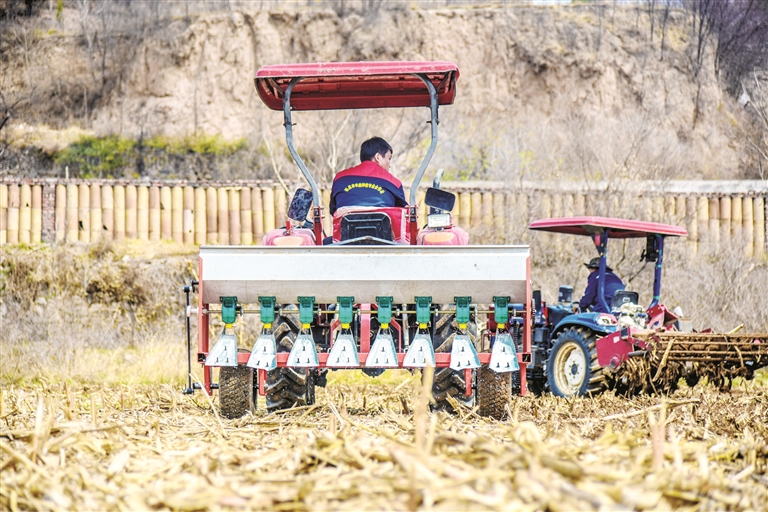 4月9日,市丰鑫种植专业合作社的农机手开展春耕春播作业,田间地头一派热闹繁忙景象。目前,该合作社种植面积三千余亩,主要种植玉米和谷子,通过发展“务工+土地”托管种植模式,把农户的耕地集中起来,充分发挥合作社现代化机械设备优势,以集中种植、科学管理、统一经营的现代化农业模式实现粮食增产、农业增效、农民增收。张泽慧摄