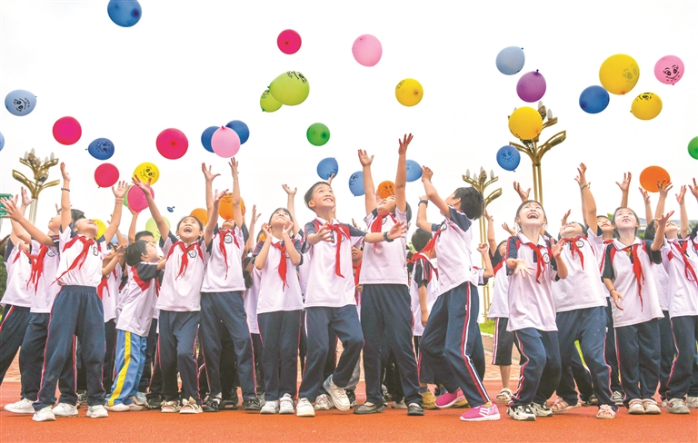 5月8日,在湖南省永州市道县第二小学,学生放飞笑脸气球。