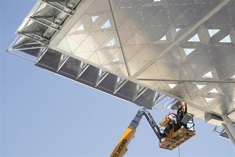 在北京城市副中心站综合交通枢纽工程施工现场,工程主体结构、装饰装修、“京帆”屋盖施工和机电设备安装等正有序推进。为了应对高温天气的影响,建设施工方通过调整户外施工人员作业时间,发放防暑药品、饮品等方式保障户外施工人员的健康安全,确保工程建设稳步推进。新华社记者鞠焕宗摄