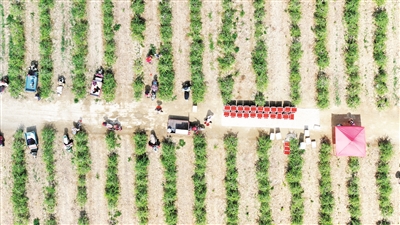 6月12日,采摘工在枸杞地里采摘枸杞(无人机照片)。