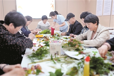 10月10日,老人们在社区邻里中心学做重阳主题的花饰。