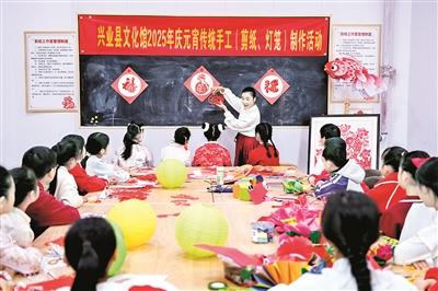寒假里,广西玉林市兴业县教育部门与县文化馆通过组织剪纸、制作灯笼、包汤圆等趣味活动,丰富学生的假期生活,迎接即将到来的元宵佳节。