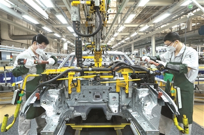 3月25日,在位于青岛市即墨区的一汽—大众青岛基地焊装车间,工人进行生产作业。