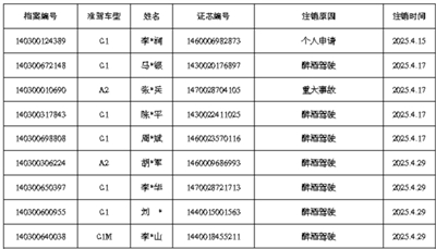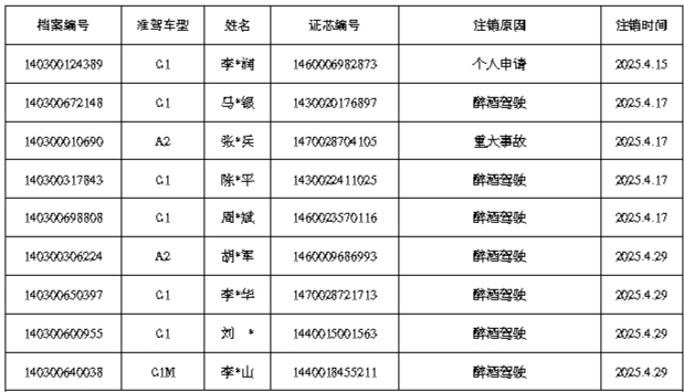 根据《机动车驾驶证申领和使用规定》(公安部162号令)第七十九条第一款第六项之规定,现公布以下机动车驾驶人驾驶证被注销。