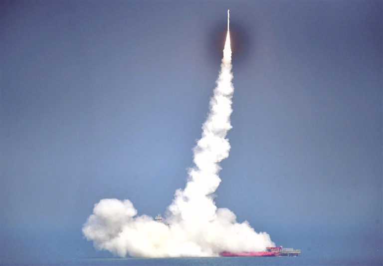 5月19日15时38分,我国太原卫星发射中心在山东附近海域成功发射谷神星一号海射型遥五运载火箭,搭载发射的天启星座05组卫星顺利进入预定轨道,飞行试验任务获得圆满成功。新华社记者郭绪雷摄