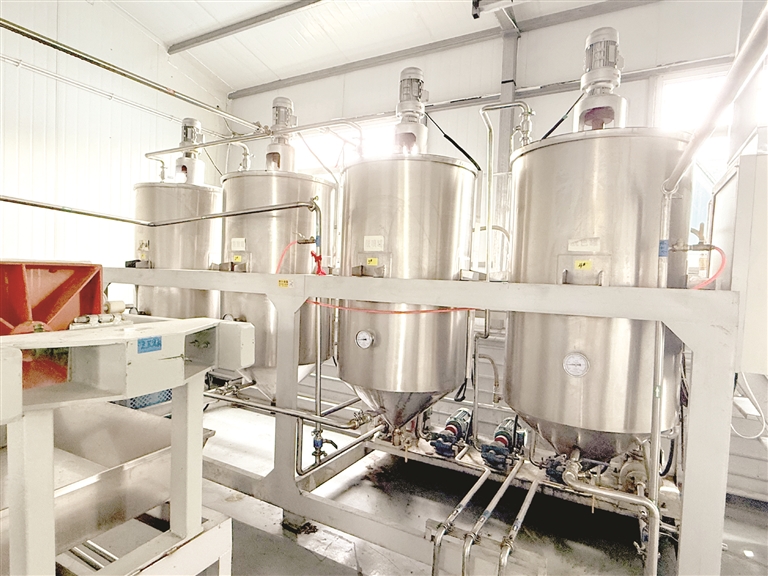 公司的榨油车间里,到处是紫苏籽特有的香味。车间员工崔国芳把紫苏籽倒进大型振动筛。机器运转,能去除混杂在紫苏籽中的尘土、沙粒与细小枝叶碎片,将色泽饱满、颗粒均匀的优质籽保留下来,再进行脱壳。紫苏籽进入脱壳机后,通过撞击与摩擦作用,籽粒坚硬的外壳与内部仁粒分离,脱去黑色外壳,变成米黄色。“这一步至关重要。筛选脱壳做好了,才能提升后续出油率和油的纯净度。”崔国芳说。