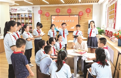 7月7日,来自上站小学的20余名小记者走进城区上站街道市政府大院社区,开展“我眼中的共产党员”系列采访实践活动。活动中,小记者与3位社区老党员进行了互动,并参加社区故事会,在活动中提升综合素养。该活动由城区新时代文明实践中心指导,城区文化和旅游局、市教育协会主办。图为小记者对老党员孟宏儒进行采访。刘 胜摄