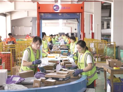 图为9月4日快递入港后工人紧张有序分拣。文国强摄