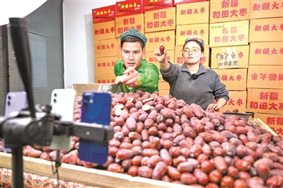 在新疆和田地区墨玉县,新疆自由落体网络科技有限公司的主播在直播带货(1月9日摄)。春节临近,新疆特色年货迎来销售旺季,和田薄皮核桃、红枣等农特产品,成为全国消费者置办年礼的热门之选。和田地区电商企业借力直播带货、网上年货节,向全国推介优质好物。新华社记者丁 磊摄