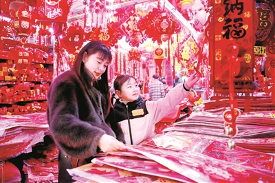 春节临近,春联、“福”字、窗花、红灯笼等春节饰品热销。图为2月3日,市民在我市一家商贸城挑选新春节庆饰品。杨园园摄