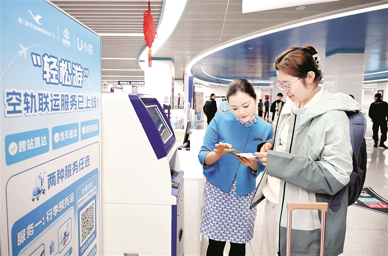 2月6日,位于滨海快线福州火车站的厦门航空福州空轨联运城市服务中心正式启用。到福州长乐国际机场乘坐航班的旅客可在该中心办理提前值机和领取登机牌手续,并在现场享受行李寄送到福州长乐国际机场的服务。新华社记者林善传摄