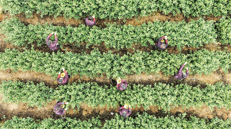 2月6日,广西三江侗族自治县林溪镇高友村的侗族群众在采摘早春茶(无人机照片)。