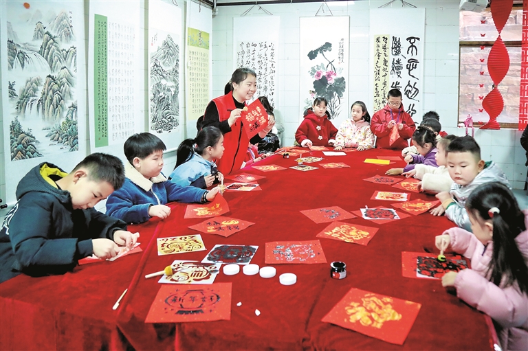 2月9日,城区小阳泉北社区开展“萌娃闹春·乐享民俗”活动,吸引了辖区30余名儿童参与。活动现场,孩子们在社区工作人员的带领下体验拓印祈福、传统投壶竞技等项目,在实践中感受传统民俗的魅力。图为孩子们体验拓印。张泽慧摄