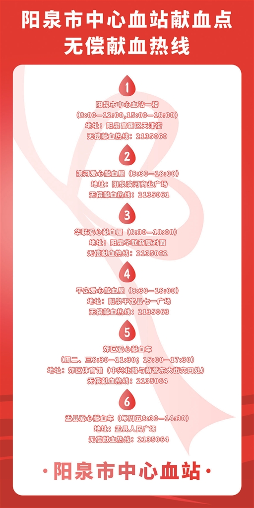 阳泉市中心血站献血点无偿献血热线