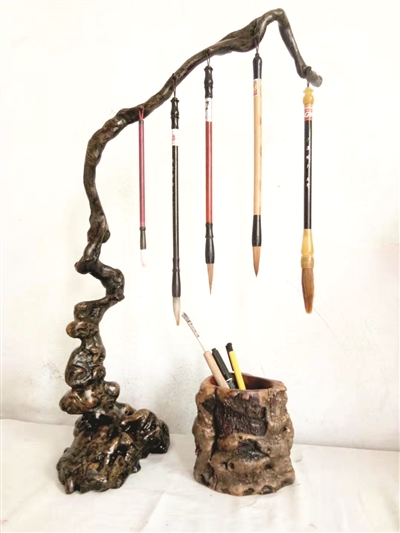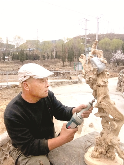 来到张永红家的小院,人们如同置身于一个根雕展览馆,目之所及根雕所需的各式材料和工具摆得整整齐齐。“也许在别人眼中这些树根毫无美感,甚至很丑,但在我这里可都是‘宝贝疙瘩’。”张永红摩挲着刚刚收集到的树根说,“我打小就喜欢画画、手工,一有空闲时间就爱鼓捣点小玩意,这也许就是我喜欢上根雕的原因吧。”