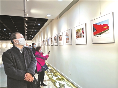 近日,“同舟共济 共庆百年华诞”民革阳泉市委员会庆祝中国共产党成立100周年艺术作品展在市展览馆开展,展出的作品包括书画、摄影、集邮、手工艺作品等400余件。本次展览由民革阳泉市委会主办,截至20日结束。图为市民在观看摄影作品。刘 胜摄