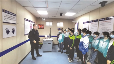这些中学生由交警王宇龙带领来到办案中心,参观了登记室、信息采集室、安全检查室、询问室、讯问室、醒酒室……王宇龙重点给大家讲解了讯问室与询问室的区别,学生们也“变身”为当事人,体验指认“犯罪嫌疑人”的过程。
