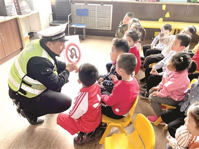 4月9日,城区南深沟社区联合交警二大队民警,在艺佳佳幼儿园开展交通安全知识讲座。通过互动交流,孩子们熟悉了交通信号标识,提高了交通安全意识和自我防范意识。 史桓昭摄