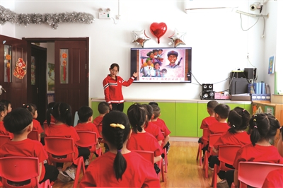 5月18日,上五渡幼儿园通过唱儿歌、讲故事等形式,让孩子们从小树立爱党爱国情怀,薪火传承红色基因。潘冬子、王二小、小萝卜头等小英雄的故事,让孩子们听得入迷,沉浸在过去的岁月里。张春林摄