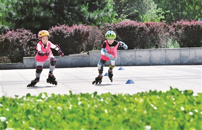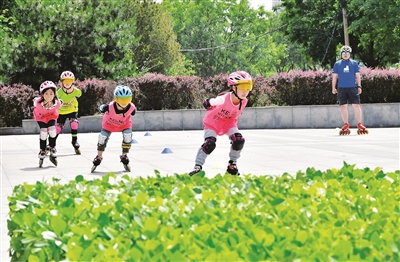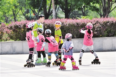 5月23日,在城市中心公园,孩子们在教练的精心指导下练习轮滑。周末时间,不少家长带着孩子参加轮滑练习,以增强孩子的体质,享受运动的快乐。 晋向华摄