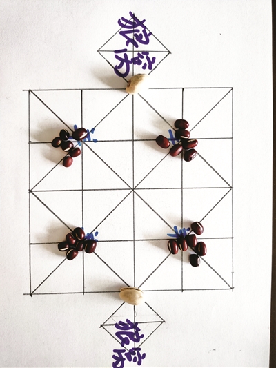 此为二人游戏,棋盘内共有25个 交叉点,2狼对24羊。狼先走,按路线跳过一只羊,就可吃掉此羊。羊的目标是四面围堵,把狼困死。