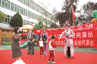 10月14日,城区实验幼儿园邀请幼儿的家长,来到幼儿园和孩子们一起参加“老幼同乐、情暧重阳”文艺演出活动。当日,幼儿家长表演了歌舞、模特走秀、豫剧《拾玉镯》片断等形式多样的文艺节目,由小班幼儿表演的手势舞《中华孝道》博得观众的不断掌声,老幼互动,欢声笑语久久回荡。张春林摄