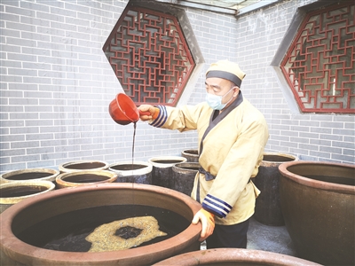 山西老陈醋作为中国四大名醋之一,熏香味是它区别于其他的典型风味。熏香味从哪里来?刘润昌说最主要是得益于咱们山西独创的熏醅技术。制醋的主要原料在经过研磨、蒸制、搅拌、酒精发酵和醋酸发酵工序后,就会熏醅。熏醅是酯化过程,通过熏醅使醋增色、增香。接着,工人通过淋醋工序,把醋醅中的醋酸及有益成分过滤出来。刚淋好的“新醋”口感欠佳,需要经过“夏伏晒、冬捞冰”的陈酿。三年陈酿、五年陈酿、八年陈酿……融入风的味道、阳光的味道、时间的味道,终于形成了“食而绵酸、口感醇厚、滋味柔和、余香绵长”的“晋阳府”老陈醋。