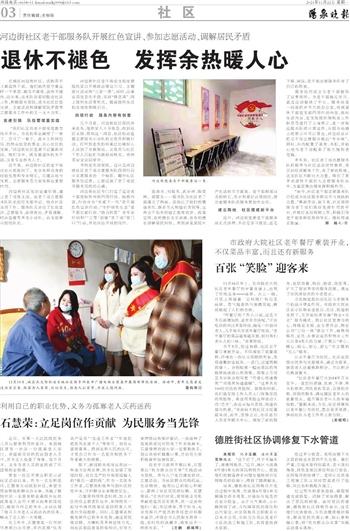 经过两天的紧张抢修,破裂管道完成修复,消除了安全隐患,解决了居民的顾虑。面对居民的感谢,德胜街社区网格员表示,这是他们应该做的,今后会继续做好服务,解决居民的揪心事、烦心事和操心事,将“我为群众办实事”实践活动落实落细。