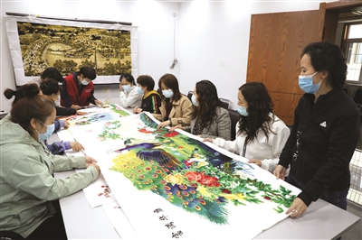 4月30日,城区河边街社区开展“筑梦新时代 巾帼展风采”主题活动,邀请十字绣手艺人李桂荣传授十字绣技艺。图为李桂荣(右一)向社区的姐妹们讲述十字绣制作过程。张春林摄