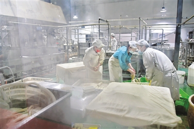 近日,在山西玩豆食品商贸有限公司的车间内,工人们正在加工各类豆制品。山西玩豆食品商贸有限公司是我市生产规模较大的一家豆制品加工企业。公司现有3个生产车间,日加工优质黄豆3吨,可生产豆腐、豆腐干、素鸡等豆制品。公司的豆制品主要销往阳泉农产品批发市场、华通农贸市场等。 晋向华摄