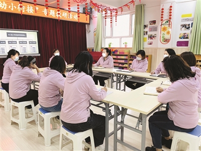 城区实验幼儿园作为试点园,多年来不断探索“幼小衔接”教育实践。老师们从衔接的目标、内容、力度三方面入手,每周作教研,为幼儿规划好入学准备活动的时间表、路线图,从幼儿身心发展规律和特点出发,合理组织一日活动,将身心准备、生活准备、社会准备、学习准备的内容与目标有机渗透于幼儿园三年保育教育工作全过程。比如,在生活能力的培养上,小班的幼儿帮助同伴穿、脱衣服,中班的幼儿帮助老师分发餐具,大班的幼儿尝试做值日生擦桌子、整理床铺;在阅读能力的培养上,幼儿园通过晨间阅读、亲子阅读、同伴阅读等形式,穿插小游戏来增强幼儿的阅读兴趣;在插雪花片、搭积木、系鞋带等活动中,幼儿锻炼了小肌肉和手眼协调能力,为写字打下基础。