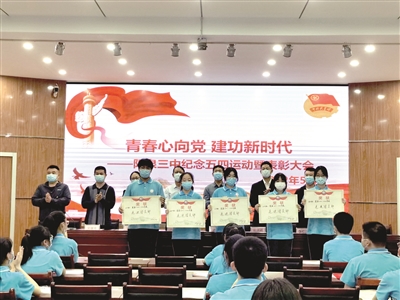5月5日下午,市三中召开“青春心向党 建功新时代”主题活动暨表彰大会。校领导为先进集体和个人进行了颁奖,学校相关部门负责人和团员青年代表参加了表彰会。