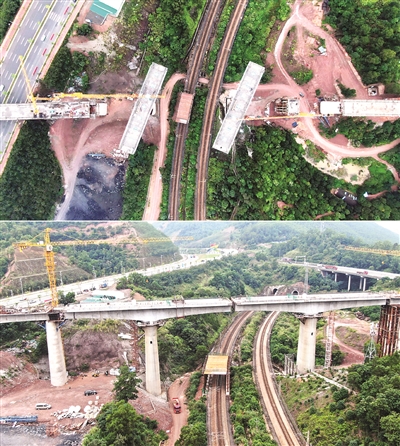 上图为转体前的广汕高铁跨京九铁路特大桥连续梁(5月8日摄);下图为转体后的广汕高铁跨京九铁路特大桥连续梁(5月9日摄)。