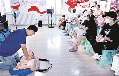 7月6日,城区滨河东社区开展应急救护知识讲座。活动现场,市红十字会的工作人员向社区居民介绍了应急救护的基本知识,重点围绕心肺复苏、海姆立克急救法、外伤包扎紧急救护技术进行了讲解,并采用现场操作的形式,让居民参与进来,使大家对应急救护知识有了进一步了解。 晋向华摄