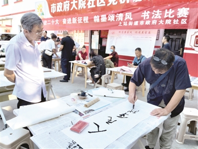 7月28日,市政府大院社区举办主题书法比赛。现场,驻地单位在职党员、社区直管党员及青少年等20余名书法爱好者以纸为媒,在墨香中阐释对清廉的理解。史桓昭摄