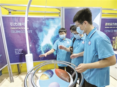 走进“中国流动科技馆”,映入眼帘的是太空探索展区。满天星斗有何运动规律?怎样才能看得更清晰?……跟随着展区提示的一个个问题,学生们与展品展开互动,感受太空的魅力。学生们在天文望远镜装置面前,纷纷弯下腰体验天文望远镜下的深空;在“引力弹弓”模型面前,学生们转动模型圆盘、拨动单摆,感受不同方向的旋转对单摆摆动的加速度的变化,感悟“引力弹弓”的运行原理;在“人类的太空之家”展台面前,学生纷纷拿出手机拍下模拟天宫空间站里宇航员工作的样子。