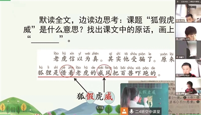 在课例展示环节,张月娇老师讲了部编版语文二年级上册中的《狐假虎威》一课,二(4)班全体学生在线聆听课程。开课之前,张月娇设计了“图片猜猜猜”环节吸引学生兴趣,把学生吸引到“空中课堂”,并用在线上课铃声营造上课氛围,让学生快速进入上课状态。