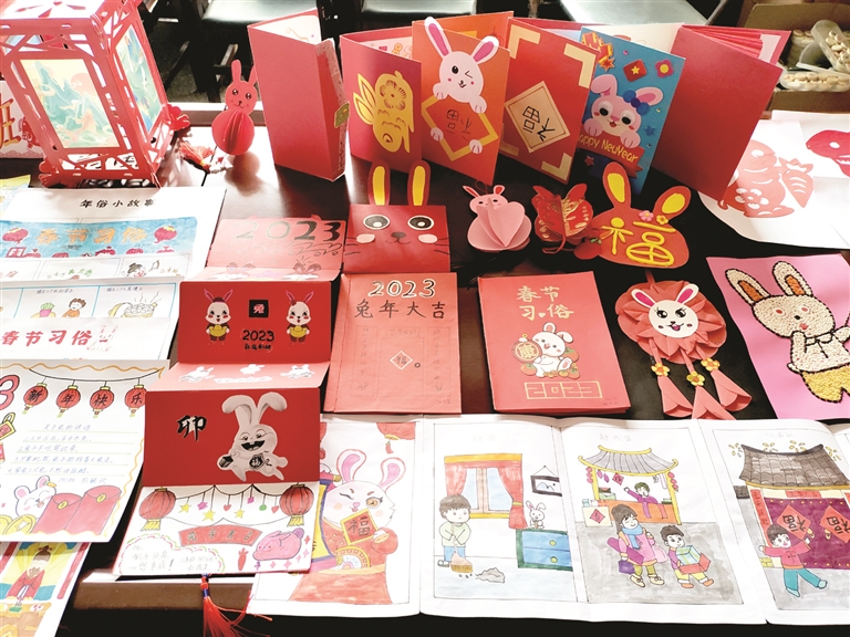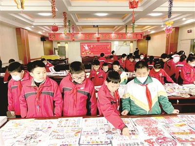 “爆竹声中一岁除,春风送暖入屠苏”。三至六年级以“春节”为主题的搜集年俗、绘制年画、制作花灯贺卡的综合实践作业,画面生动,色彩丰富,引来众多师生驻足观看,啧啧称赞。贴窗花、拜大年、逛花灯……一个个画面,将春节的传统习俗展现得淋漓尽致;大红灯笼、宣纸宫灯、面塑孔雀、立体贺卡,在孩子们的作品中感受浓浓的“年味”,领略多彩的中华传统文化,年的味道犹在心间。
