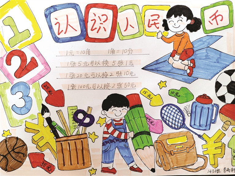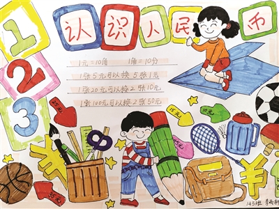 “数里乾坤大,形中日月长”。一、二年级的数学作业依据儿童以形象思维为主的特点,将课本上所学的认识时间、认识人民币的相关知识,在父母的帮助下,巧妙地变成了一幅幅生动活泼又好玩的数学画报。三年级数学以“走进生活,找寻数学的影子”为主题的学科综合实践作业,让学生走进生活,用数学的眼光去观察,用数学的工具去度量,用数学的方式去记录。141班的李安淇设计的画报中记录着:桃酥饼干一提1千克,橘子罐头每瓶245克,每箱12瓶;142班的代明哲测量了冰箱高180厘米,等于1.8米……一张张图片、一个个数据,图文并茂地记录着生活中常见物品的质量和长度,柴米油盐的生活味中蕴含着浓浓的“数学味”。