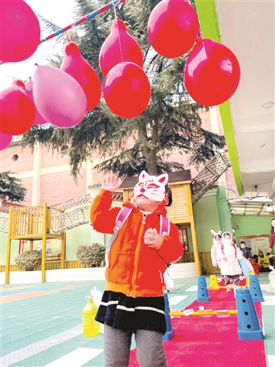 带着小礼物,孩子们高兴地走上红毯。接着,他们跨过一个个寓意美好的栏杆,来到挂着气球的“摸高”处。在老师们的积极鼓励下,孩子们向上跳起,伸手触摸气球,寓意新的一年人人都能长高。孩子们玩了“摸高”游戏意犹未尽,脸上露出满足的笑容。