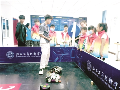 本报讯 记者顾超摄影报道 5月20日,位于山西工程技术学院的山工智泉机器人教育实践基地里,来自高新区各中小学的36名青少年兴致盎然地操控着智能车展开比赛。一块块塑料板彼此拼接,搭建成颇具挑战性的赛道,孩子们通过遥控操控着智能小车,使其在最短时间内完成比赛路线。