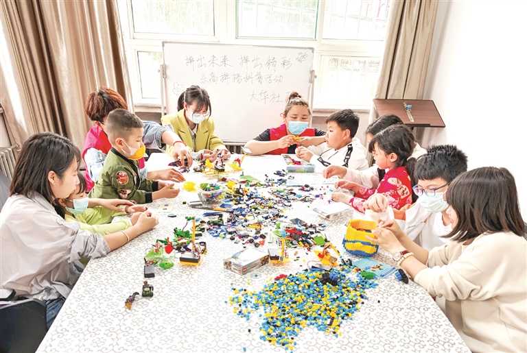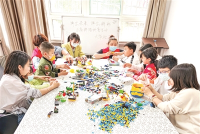 活动中,社区工作人员向孩子们讲解了乐高积木的板件特征以及搭建方法,鼓励孩子们发挥想象力进行创作,以此培养他们的手眼协调能力、观察力和团队合作能力。张泽慧摄