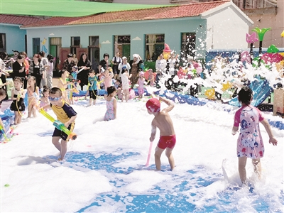 在欢腾的老虎沟幼儿园里,动听的笑声、美妙的音乐、雪白的泡泡交织在一起,绘制出一幅动人的画卷。郭 宙文/图