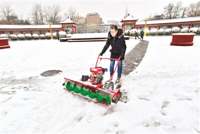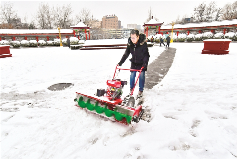 12月11日至12日,市园林管理处工人使用手推式除雪机对辖区公园、广场等处的道路、绿化带积雪进行清扫,为市民营造安全的游园环境。晋向华摄
