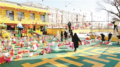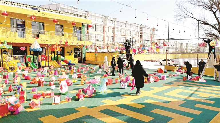 | 为了让孩子们感受元宵节传统文化,近日,街上幼儿园举办了手工花灯展,迎接孩子们“回家”。图为老师们悬挂花灯。 白 鹭摄 |